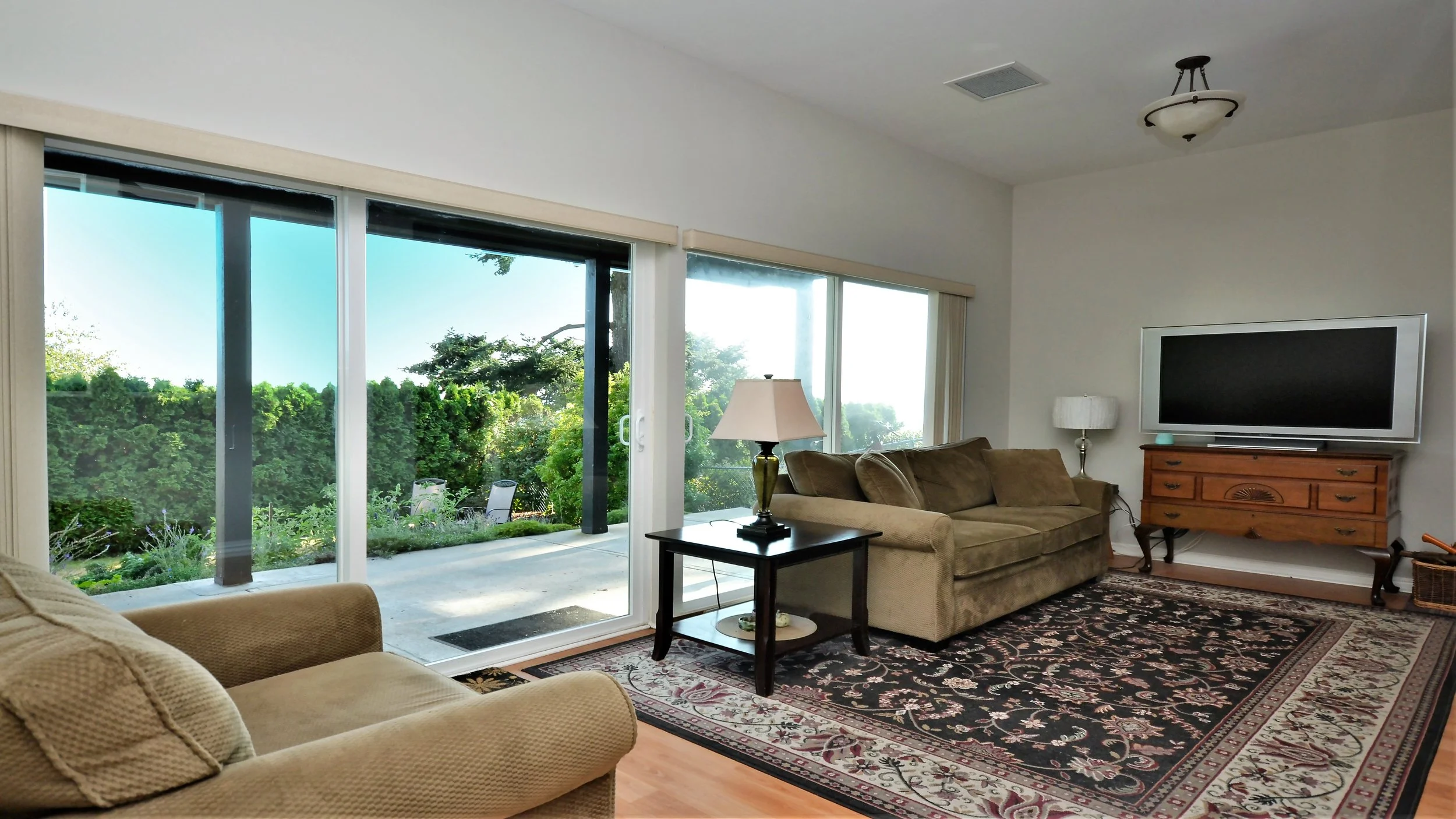 LIVING AREA FEATURES: WEST VIEW OF THE OCEAN LARGE WINDOWS AND SLIDING DOOR THAT OPENS TO GROUND PATIO AND ESTABLISHED YARD. COOL VINTAGE FIRPLACE. WOOD FLOORS
