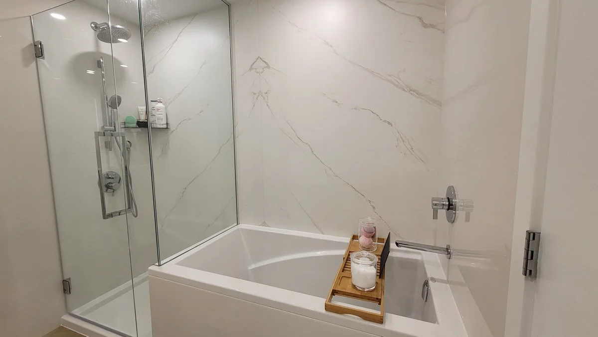 Elegant lighting and premium tilework create a true spa-like experience